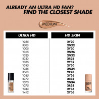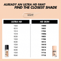 O que mais você precisa saber: A versão nova e aprimorada da Ultra HD Foundation é alimentada por tecnologia que melhora o desempenho e a indetectabilidade, para uma pele que se parece com a pele sob qualquer luz. Confortável e fácil de aplicar, esta base de cobertura média a total flexiona com a pele para não endurecer ou assentar nas linhas. O HD Skin é vegano, não comedogênico, à prova d'água, à prova de suor e vem em uma embalagem mais sustentável*.