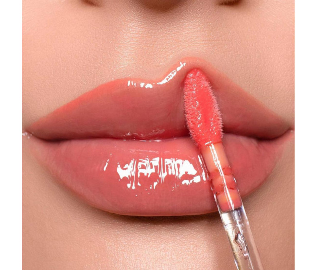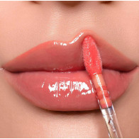 Um gloss com um leve tom de boca avermelhado, possui uma textura gelatinosa que proporciona aos lábios um efeito espelhado.