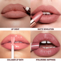 O que é: um conjunto labial de quatro peças com um Hyaluronic Happikiss em tamanho real, além de um batom Matte Revolution tamanho de viagem, delineador Lip Cheat e banho de colágeno para lábios.