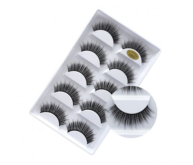 Cartela com 5 pares de cílios 3D, sintéticos, efeito natural.