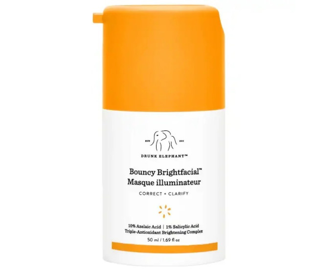Revitalize a pele com a máscara de aumento do brilho facial Drunk Elephant Bouncy Bright. Ele oferece uma dose superalimentada de ácido azelaico e salicílico profundamente na pele para esclarecer o tom desigual, desbotar as manchas e reduzir a aparência de vermelhidão para revelar uma tez mais brilhante e uniforme.