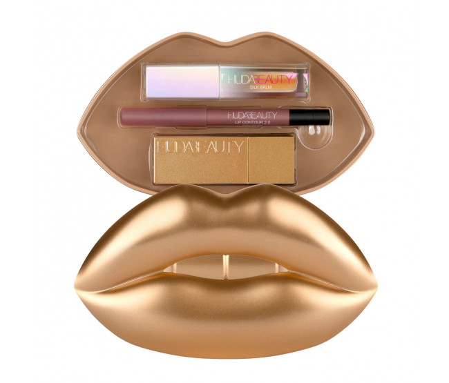 Um conjunto de edição limitada que inclui um batom em tamanho real, um lápis de lábios em tamanho mínimo e um brilho em tamanho mínimo em um estojo super chique, dourado e reutilizável em forma de lábio.