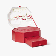 Caixa colecionável com um elegante motivo que retrata uma vila coberta de neve, reutilizável como porta-joias ou organizador de beleza, com uma parte superior que se abre para cima e uma gaveta central.