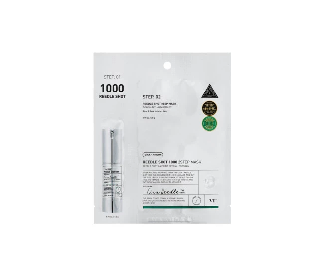 VT Cosmetics Cica Reedle Shot 1000 2-Step Mask é uma máscara facial especializada que ajuda a hidratar profundamente, refinar a aparência dos poros e melhorar a textura da pele.