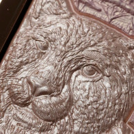 Para completar o tema, a embalagem do pó apresenta um relevo que retrata uma cena intrincada da savana do Serengeti, com uma chita deslumbrante relaxando na grama, cercada por girafas e acácias, banhada pelo pôr do sol.
